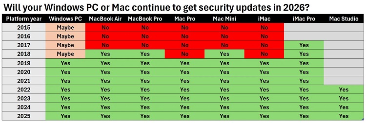 در نهایت اینکه، چه از مک استفاده میکنید و چه ویندوز، دستگاه شما معمولاً بین ۸ تا ۱۰ سال از زمان عرضه چیپ اصلی آن، پشتیبانی امنیتی خواهد داشت. اما خرید دستگاه قدیمیتر میتواند این بازه را کوتاه کند.