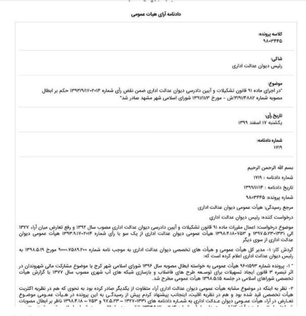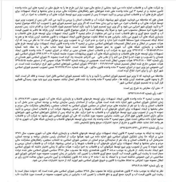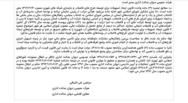 به گزارش خبرگزاری فارس از مشهد، دیوان عدالت ادارای طی دادنامه ۱۷۱۹ مورخ چهاردهم بهمن ماه سال ۹۹، مصوبه ۹۳/۱۳۴۰۶ مورخ ۲۱ بهمن ماه سال ۹۳ شورای شهر(تحت عنوان تبصره۳ قانون ایجاد تسهیلات برای توسعه طرحهای فاضلاب) را که به شرکت آبفا اجازه میداد عوارضی را در فیشهای صادره شهروندان لحاظ کند، لغو کرد.