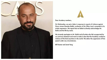 در این نامه آمده است: «روز چهارشنبه، نامهای در پاسخ به گزارشهای خشونت علیه فیلمساز برنده اسکار حمدان بلال، کارگردان مشترک فیلم «سرزمین دیگر وجود نیست»، در ارتباط با بیان هنری او ارسال کردیم. متأسفیم که نتوانستیم مستقیماً به آقای بلال و فیلم او با نام اشاره کنیم. ما صمیمانه از آقای بلال و تمام هنرمندانی که از بیانیه قبلی ما احساس بیپشتیبانی کردند عذرخواهی میکنیم و میخواهیم واضح بگوییم که آکادمی هرگونه خشونت از این دست را در هر نقطه از جهان محکوم میکند. ما از سرکوب آزادی بیان تحت هر شرایطی متنفریم.»