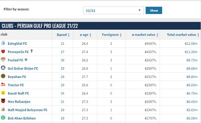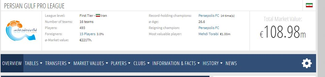 طبق اعلام این رسانه آماری، لیگ برتر فوتبال کشورمان در این فصل 108.98 میلیون یورو تخمین زده شده است. ارزشمندترین باشگاه کشورمان مثل سال گذشته، استقلال تهران است.