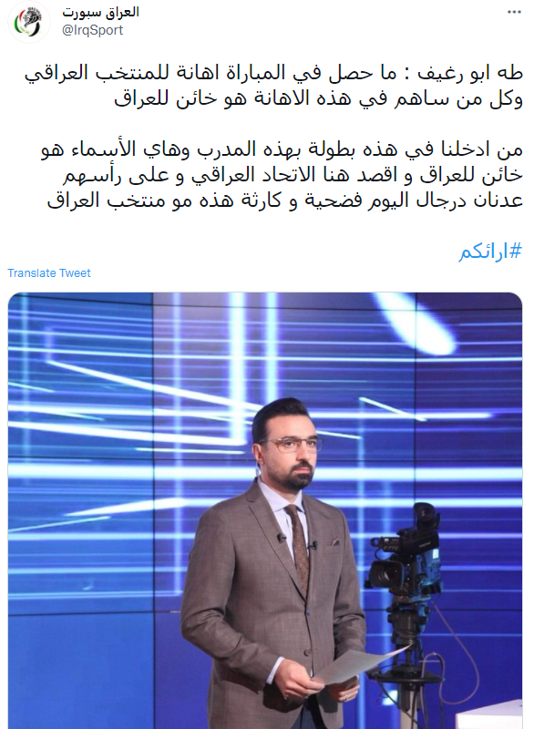 به نقل از سایت ورزش عراق، طه ابو رغیف گفت: چیزی که در این مسابقه رخ داد، توهین به تیم ملی عراق بود. هر کس در ارائه این تیم ملی نقش داشته خائن است. هر کس که این تیم را با این مربی به این رقابت آورده به کشور عراق خیانت کرده است.
