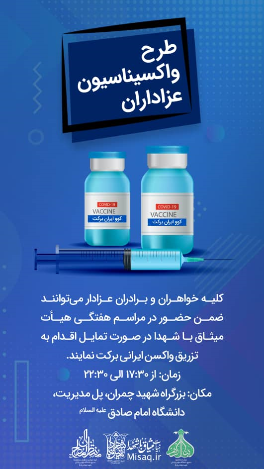 با هماهنگی صورت گرفته توسط هیأت میثاق با شهدا با مسئولین ستاد اجرایی فرمان امام خمینی(ره)، امروز طرح واکسیناسیون عزاداران در کنار مراسم هفتگی این هیأت اجرا میشود.
