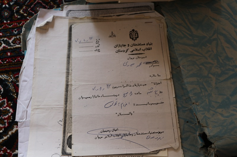 با گامهای آرام حاجمحمد به سمت خانه قدیمیشان میرویم، پلههای بلند و لب شکسته خانه را بالا میرویم، حاجمحمد عصایش را همانجا دم درب ورودی اتاق میگذارد و به پشتی قدیمی و رنگ و رورفته اتاق تکیه میدهد، ثانیه خانم بعد از خوشآمدگویی دوباره صندوقچه خاطرات همسرش را به دستم میدهد و میگوید خیلی از این عکسها و مدارک را بنیاد شهید در مقاطع مختلف بردهاند.