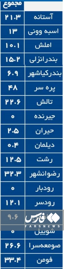 طبق آخرین گزارش هواشناسی گیلان، شهرستان فومن بیش از ۳۳ میلیمتر، رضوانشهر بیش از ۳۲ میلیمتر، صومعهسرا بیش از ۲۶ میلیمتر، آستانهاشرفیه بیش از ۲۱ میلیمتر، لاهیجان ۱۸ میلیمتر و بندرانزلی بیش از ۱۵ میلیمتر را تا حدود ساعت چهار صبح به خود اختصاص دادند.