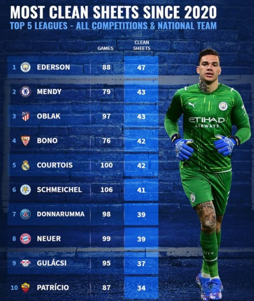 در صدر این فهرست، ادرسون سنگربان برزیلی منچستر سیتی قرار دارد. این دروازه بان در 88 بازی، 47 کلین شیت را ثبت کرده است.