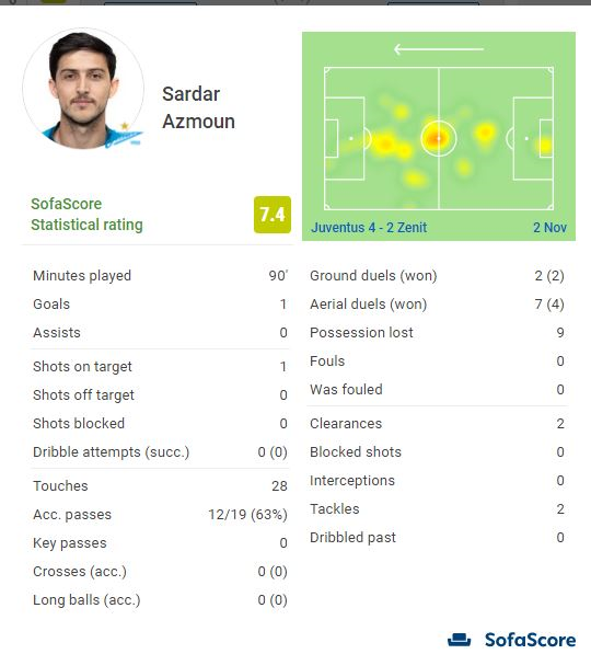 با نگاه به آمار مهاجم تیم ملی کشورمان متوجه می شوید غالبا در میانه زمین حضور داشته و نقش حرارتی نشان دهنده این واقعیت است. سردار در این بازی تنها یک بار فرصت شوت زنی به چارچوب یوونتوس را داشته و همین یک بار برای مهاجم فرصت طلب ایرانی کافی بود تا دروازه شزنی را باز کند.