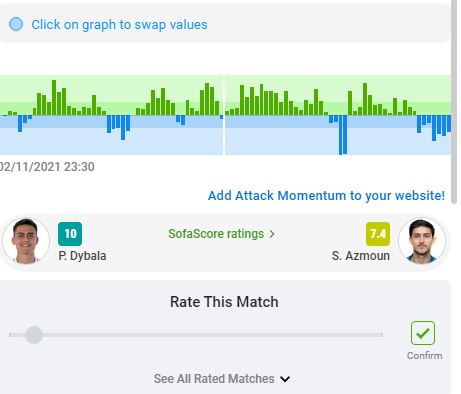 در مقابل پائولو دیبالا ستاره آرژانتینی یوونتوس با کسب 10 امتیاز بهترین بازیکن زمین شد و جایزه بهترین بازیکن را در پایان بازی از آن خود کرد.