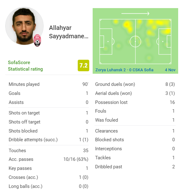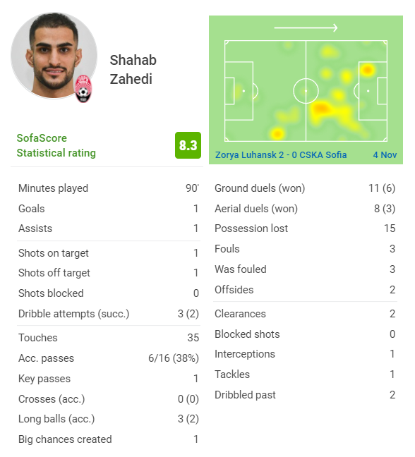در این بازی شهاب زاهدی که گل اول زوریا را به ثمر رساند با نمره 8.3 از سوی رسانه سوفا اسکور بهترین بازیکن زمین لقب گرفت. صیادمنش نیز با نمره 7.2 به عنوان نفر دوم این تیم انتخاب شد تا شب درخشش ایرانیها در اوکراین تکمیل شود.
