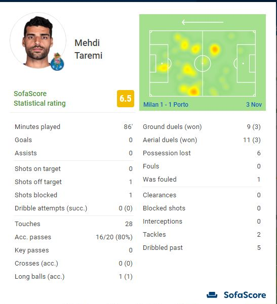 با نگاه به آمار طارمی در بازی مقابل میلان او جزو بازیکنان ضعیف میدان بود و نتوانست عملکرد درخشان همیشگی خود را برای پورتو داشته باشد. با نگاه به نقشه حرارتی حرکت های مهاجم تیم ملی متوجه می شوید این بازیکن غالبا در میانه زمین با هافبک های روسونری درگیر بوده است.