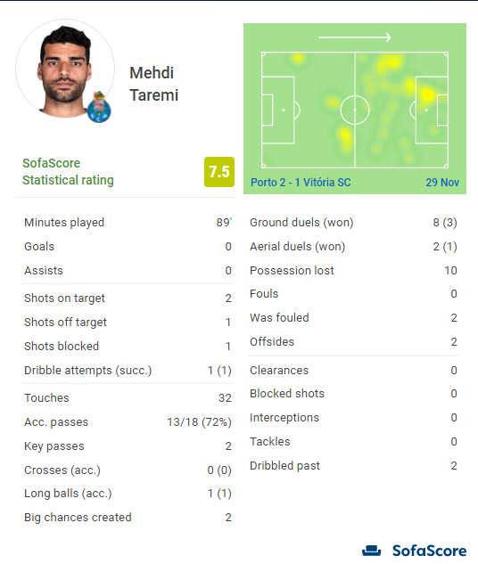 با نگاه به آمار طارمی در این بازی متوجه می شوید هر چند ستاره تیم ملی برای پورتو در این بازی گلزنی نکرد ولی بسیار تاثیرگذار بوده است.
