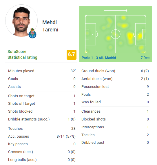 طارمی در این بازی تنها 14 پاس داد که 57 درصد آن به مقصد رسید. او در نبردهای زمینی خیلی موفق نبود و از 6 تقابل رو در رو با مدافعان اتلتیکو تنها توانست 2 بار موفق به پیروزی برابر آنها شود. در نبرد هوایی نیز از 2 دوئل، یک بار توپ را بدست آورد تا نشان دهد در نبرد هوایی قدرتمندتر ظاهر شده است. ستاره پورتو 9 بار توپ را از دست داد تا آمار ضعیفش در این مسابقه تکمیل شود.