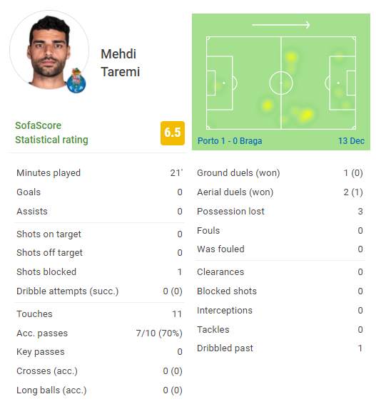 ستاره کشورمان در این مسابقه یک شوت به سمت دروازه زد که آن شوت نیز به مدافعان برخورد کرد و راهی دروازه نشد. او 11 بار توپ را لمس کرد و در مجموع 10 پاس داد که 7 پاس به درستی به بازیکنان پورتو رسید. طارمی در نبرد زمینی ناموفق ظاهر شد و یک بار که خواست بازیکن را از پیش رو بردارد، نتوانست این کار را نهایی کند. او البته در زمینه هوایی یک بار به درستی توپ را تصاحب کرد تا در این زمینه دوباره عملکرد خوبی به ثبت رساند.