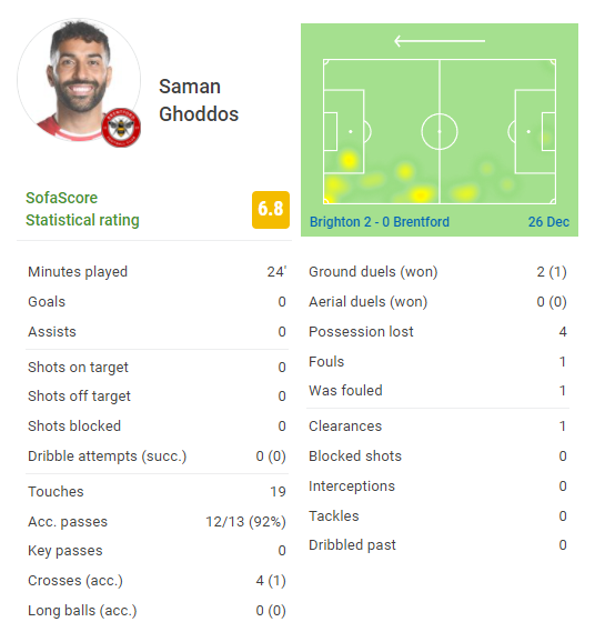 ستاره کشورمان از سوی رسانه سوفا اسکور نمره متوسط 6.8 را دریافت کرد ولی دقت پاس 92 درصدی را به ثبت رساند. او در دوئل تن به تن موفق ظاهر شد و در این 24 دقیقه نمایش مثبتی از خود نشان داد. نکته قابل توجه ، عملکرد بهتر قدوس نسبت به تامپسون و یانسن در سمت چپ بود و این احتمال وجود دارد تا این بازیکن در روزهای پرفشار سال جدید میلادی و «باکسینگدی» به ترکیب اصلی برنتفورد برسد.