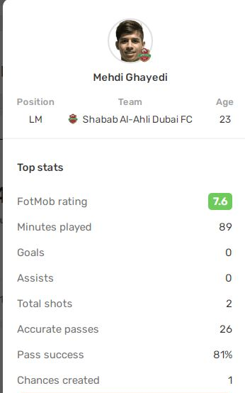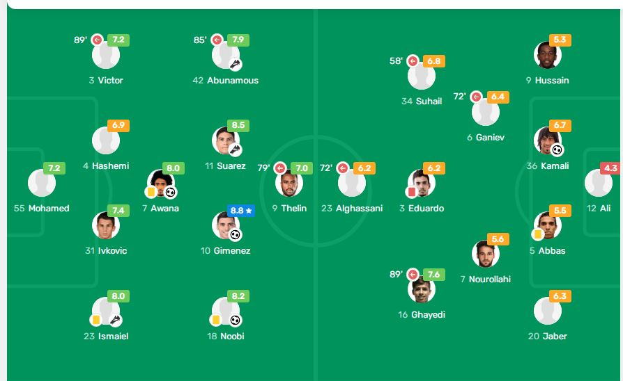 قائدی تا دقیقه 89 بازی کرد و نوراللهی 90 دقیقه برای شباب الاهلی در میدان بود. با نگاه به عملکرد این دو بازیکن ملی پوش ایرانی متوجه می شوید قائدی بهترین بازیکن تیمش بوده است.