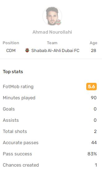 ستاره سابق پرسپولیس در این بازی با کسب امتیاز 5.6 از 10 تقریبا ضعیف ترین بازیکن زمین شد. تلاش هافبک ایرانی در این بازی بی فایده بود. با نگاه به آمارش در این بازی او هم تلاش خود را برای باز کردن دروازه بنی یاس انجام داد اما 2 بار تلاش او به در بسته خورد.