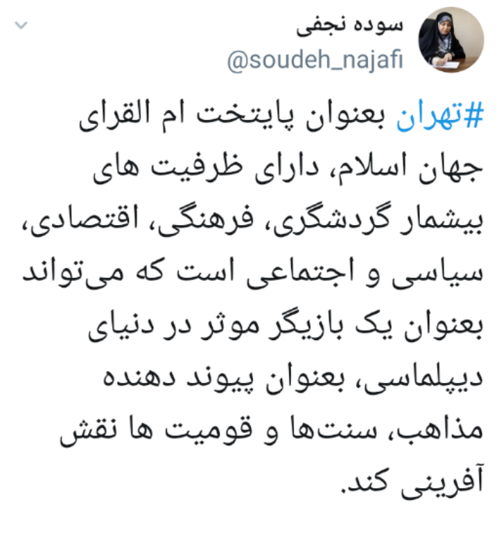 به گزارش خبرنگار شهری خبرگزاری فارس، سوده نجفی، عضو شورای شهر تهران در صفحه شخصی خود در توئیتر درباره روز تهران اظهارداشت: تهران به عنوان پایتخت ام القرای جهان اسلام دارای ظرفیت های بی شمار گردشگری، فرهنگی، اقتصادی، سیاسی و اجتماعی است.