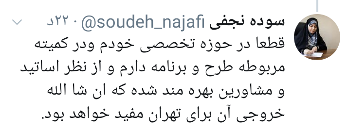 این عضو شورای شهر تهران بیان داشت: قطعا در حوزه تخصصی خودم در کمیته سلامت طرح و برنامه در این زمینه دارم و از نظر اساتید و مشاورین بهره مند شده که ان شالله خروجی آن برای تهران مفید خواهد بود.