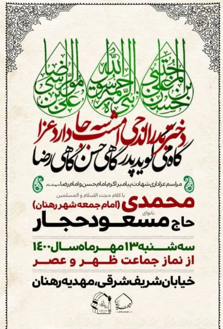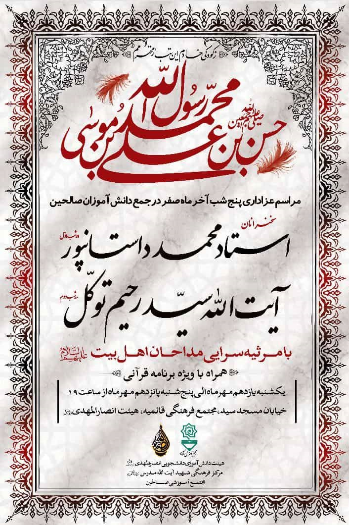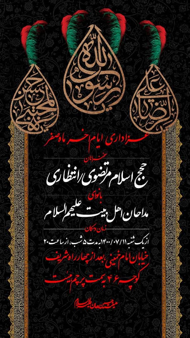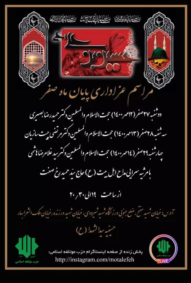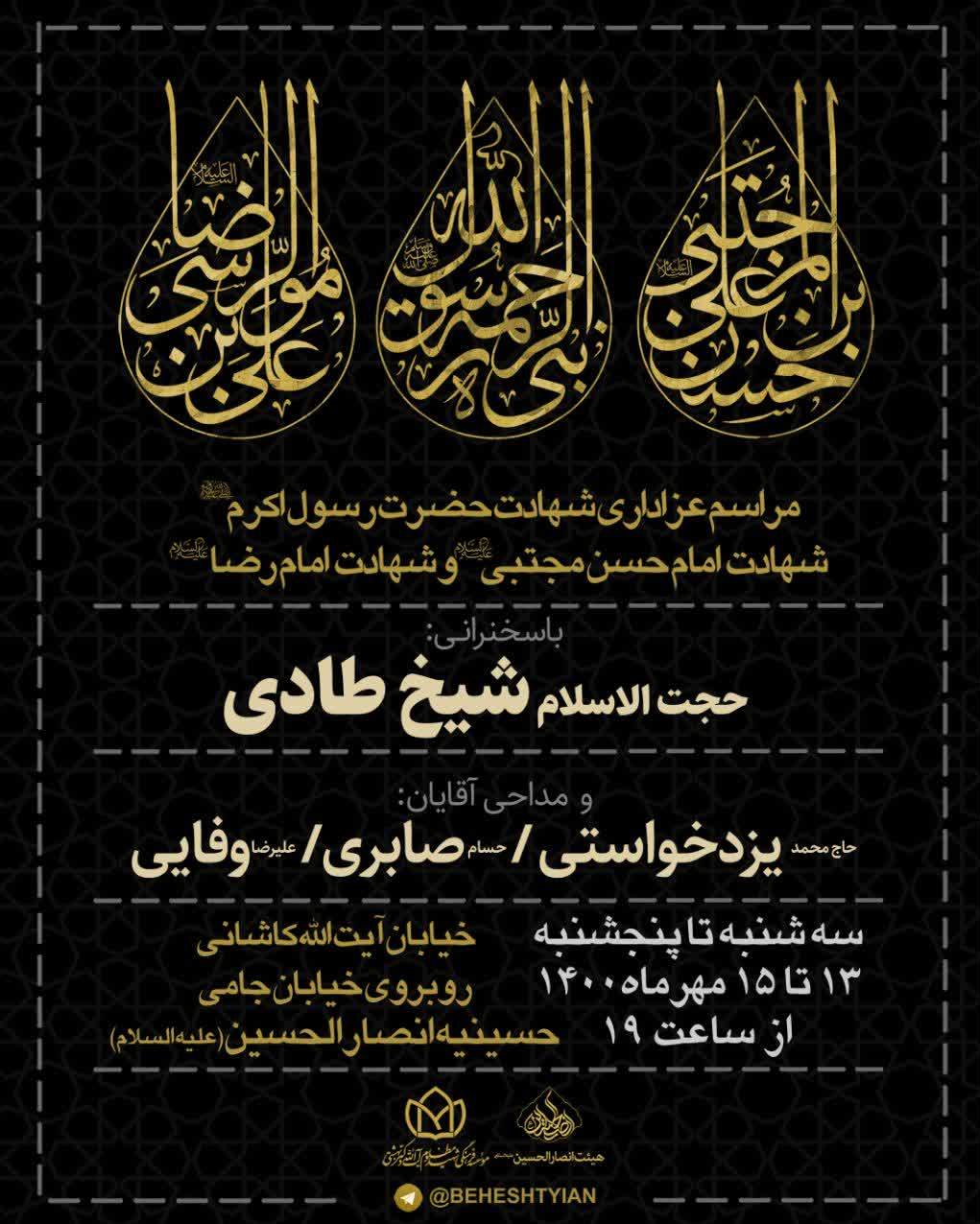 به گزارش خبرگزاری فارس از اصفهان، محرم و صفر با شهادت پیامبر اعظم (ص), امام حسن مجتبی (ع) و امام رضا(ع) به پایان میرسد و مومنان تلاش میکنند در واپسین روزها ماههایی که به گفته پیر خمین، اسلام را زنده نگه داشته است، دست به دامان ریسمان متین الهی شوند و در دریای معارف اهل بیت (ع) خود را پاکیزه و سیراب کرده و توشهای برای ادامه زندگی دنیا و سفر آخرت برگیرند که در ادامه، برنامههای هیأت های گوناگون نصف جهان، برای بهرهمندی معنوی هرچه بیشتر همشهریان عزیز مشخص شده که به شرح زیر است.