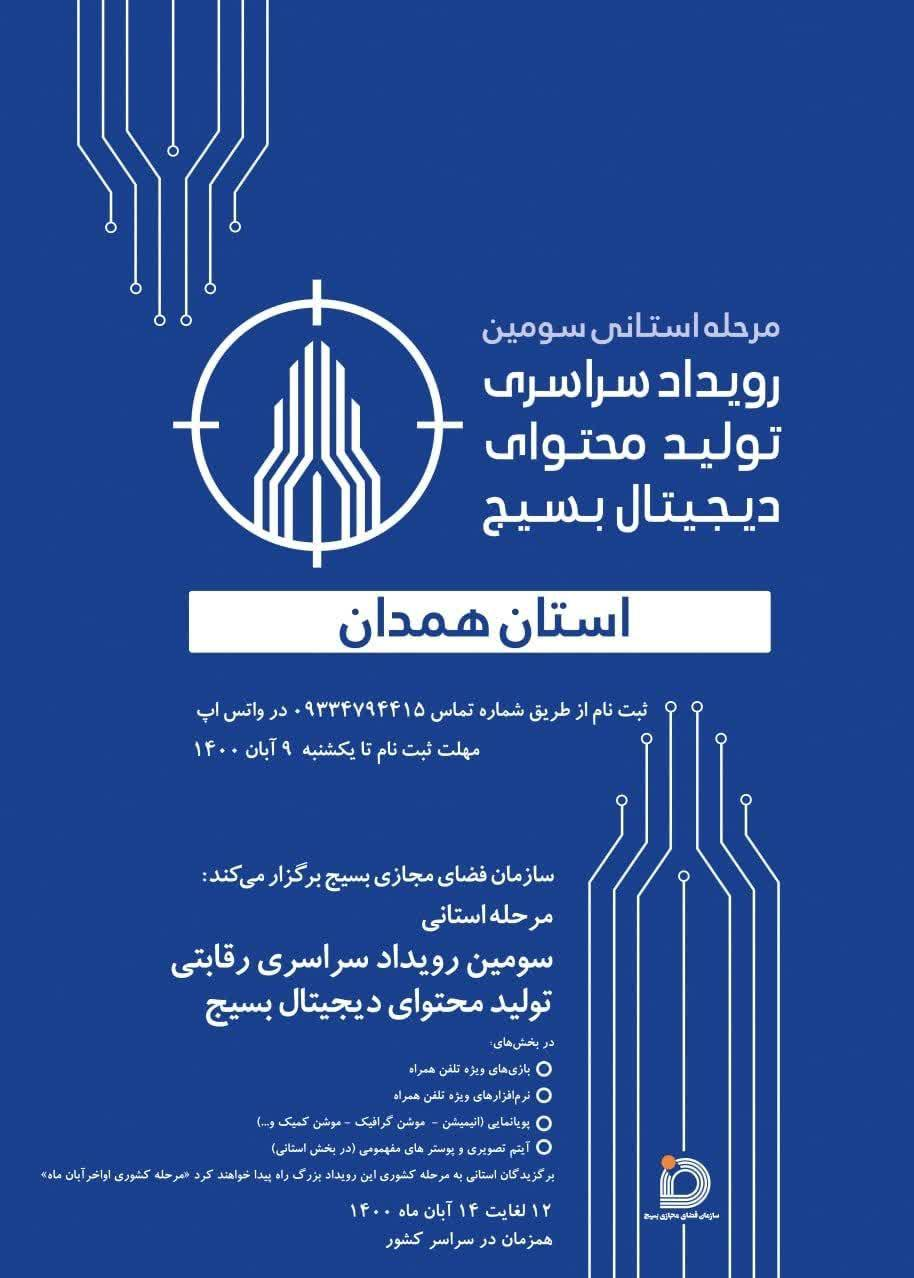 وی از برگزاری سومین رویداد رقابتی تولید محتوای فضای مجازی در همدان خبر داد و گفت: متولی برگزاری این رویداد مرکز متنا (مرکز تولید نشر دیجیتال انقلاب اسلامی) در مجموعه سازمان فضای مجازی بسیج است.