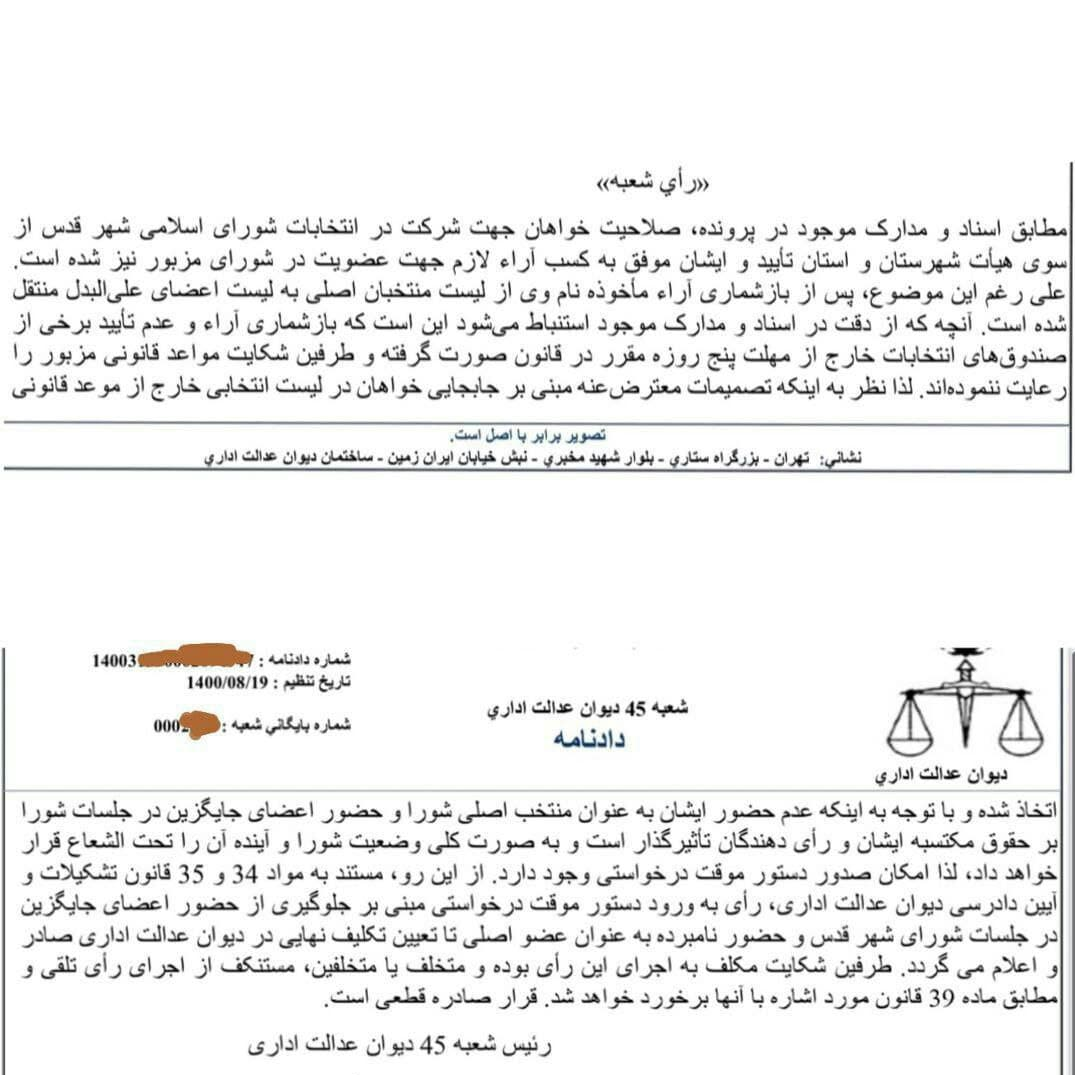 برای نمونه با رای دیوان عدالت اداری در تاریخ ۱۹ آبان ۱۴۰۰ با صدور دستور موقت از ورود اعضای جایگزین ممانعت کرده و مجوز حضور اعضای منتخب در جلسه شورا را تا صدور رای نهایی صادر کرده است. در بخشی از متن آمده: «مستند به مواد ۳۴ و ۳۵ قانون تشکیلات و آیین دادرسی دیوان عدالت اداری، رای به ورود دستور موقت درخواستی مبنی بر جلوگیری از حضور اعضای جایگزین در جلسات شورای شهرقدس و حضور نامیرده به عنوان عضو اصلی تا تعیین تکلیف نهایی در دیوان عدالت اداری صادر و اعلام میگردد».