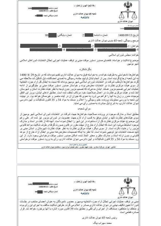 مطابق رای دیوان عدالت اداری در تاریخ ۱۴۰۰/۰۹/۱۳ آمده است:«از این رو مستند به مواد ۳۴ و ۳۵ قانون تشکیلات و آیین دادرسی دیوان عدالت اداری، رای به ورود دستور موقت درخواستی مبنی بر توقف عملیات اجرایی ابطال آراء حوزه انتخابیه بومهن و حضور نامبردگان به عنوان اعضای منتخب در جلسات شورا تا تعیین تکلیف نهایی در دیوان عدالت اداری صادر و اعلام میگردد».