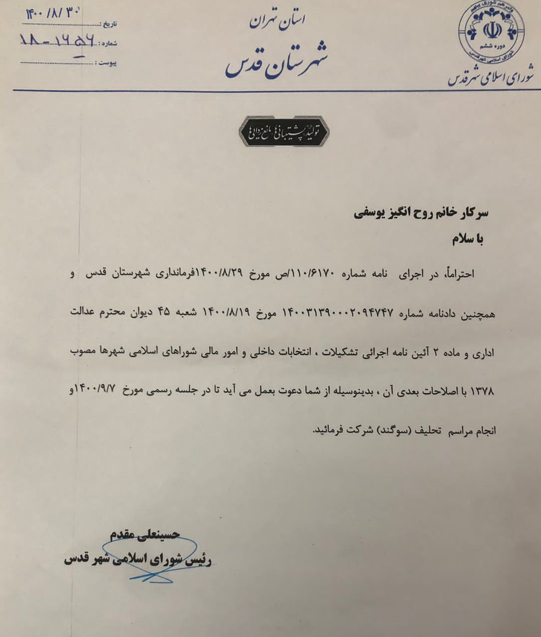 رئیس شورای شهر قدس به استناد رای دیوان از عضوی که خارج از شورا بوده جهت شرکت در مراسم تحلیف دعوت کرده است.