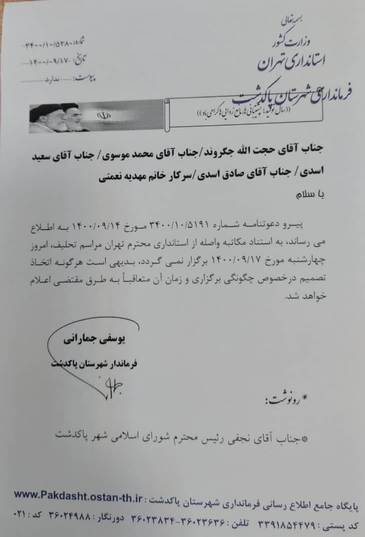 بر اساس رای دیوان عدالت اداری اعضای شورا انتظار داشتند که به عنوان عضو وارد شورا شده و عضو علی البدل که جایگزین آنها شده بود از شورا خارج شود، در همین راستا فرماندار پاکدشت طی نامهای به اعضای شورا تاریخ تحلیف را اعلام کرده بود که فرماندار طی نامهای در تاریخ ۱۷ آذر ۱۴۰۰ خطاب به ۵ عضو برکنار شده آورده است: «به استناد مکاتبه واصله از استانداری محترم تهران مراسم تحلیف، امروز چهارشنبه مورخ ۱۴۰۰/۹/۱۷ برگزار نمیگردد».