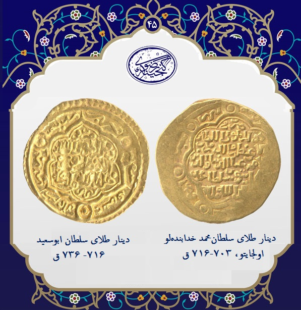 ۴۵۰ سکه تاریخی ضربِ تبریز، با قدمت ۷۰۰ سال، در گنجینه سکههای تاریخی آستان قدس رضوی نگهداری میشود. ۵۵ قطعۀ از این سکهها از جنس طلا است. این قطعات نفیس، شامل سکههای طلا و نقرۀ سلسلههای ایلخانان مغول، قراقویونلوها، صفوی، افشاری، زندیه و قاجاریه است. دینار طلای سلطان محمد خدابنده (اولجایتو) در دورۀ ۷۰۳ تا ۷۱۶ هجری قمری، قدیمیترین سکۀ این گنجینه است. بر روی این سکه علاوه بر عبارت«لاالهالاالله»، «محمد رسولالله» و «علی ولیالله» و اسامی دوازدهگانه ائمه علیهمالسلام حک شده است. این سکهها توسط محمدتقی صفار، سیدفربد مضنف و علیرضا شیخالاسلامی، از مجموعهداران نامی سکه، وقف آستان قدس رضوی شدهاست.