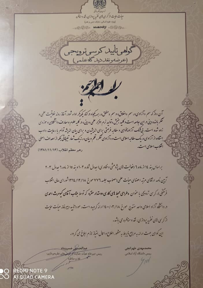 احمدی اذعان کرد: نظریه «طراحی محیطهای کاری دوستدار مغز» خردادماه امسال در دانشگاه آزاد واحد سنندج با حضور استاد حسن رنگرز دانشیار گروه مدیریت دانشگاه خوارزمی به عنوان ناقد نظریه و دکتر رضا شافعی دانشیار گروه مدیریت دانشگاه کردستان تدوین کردیم که پس از بررسی در دانشگاه آزاد، به شورای عالی فرهنگی ارسال شد که در آبان ماه امسال به نام بنده به ثبت رسید.