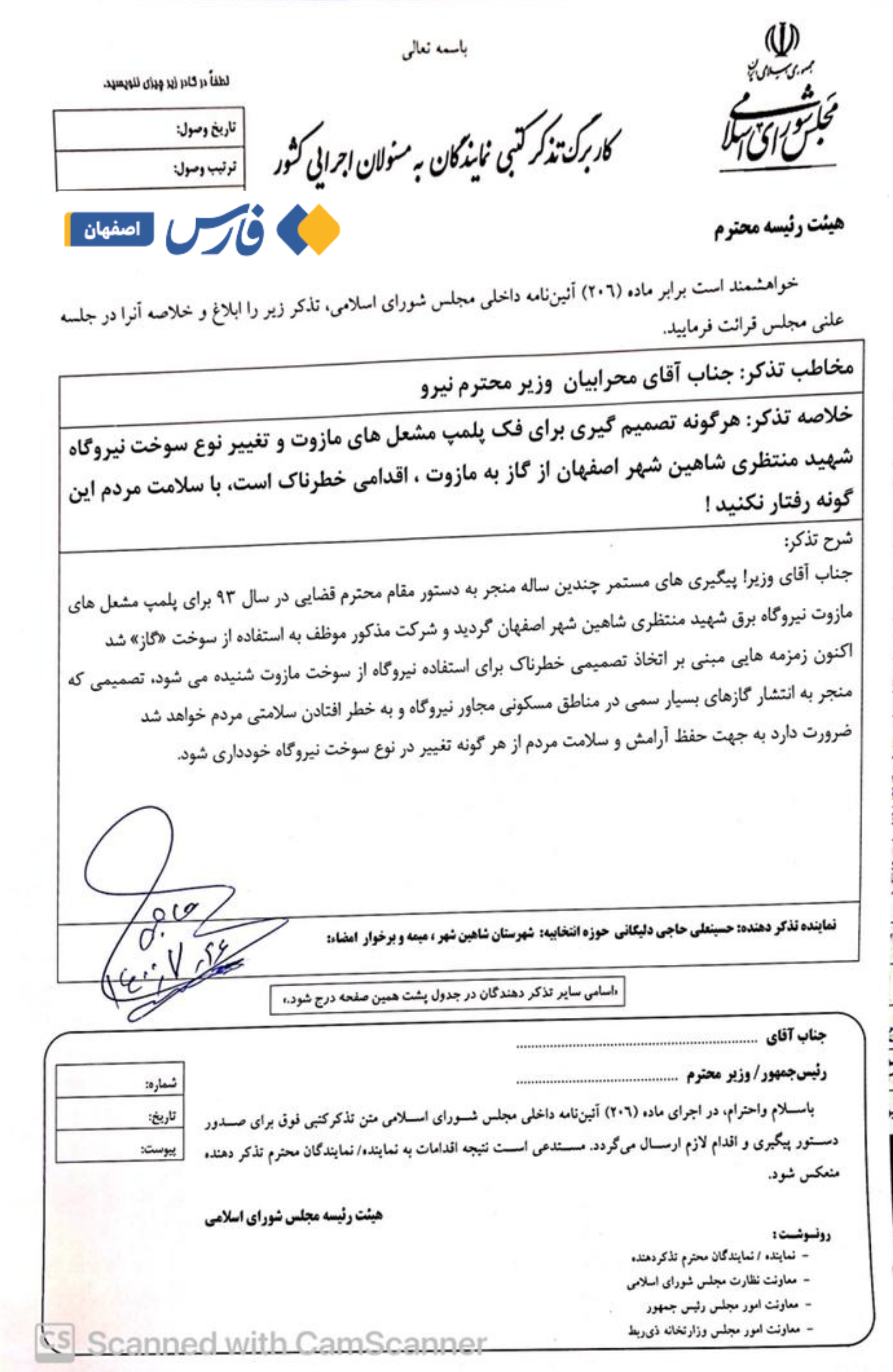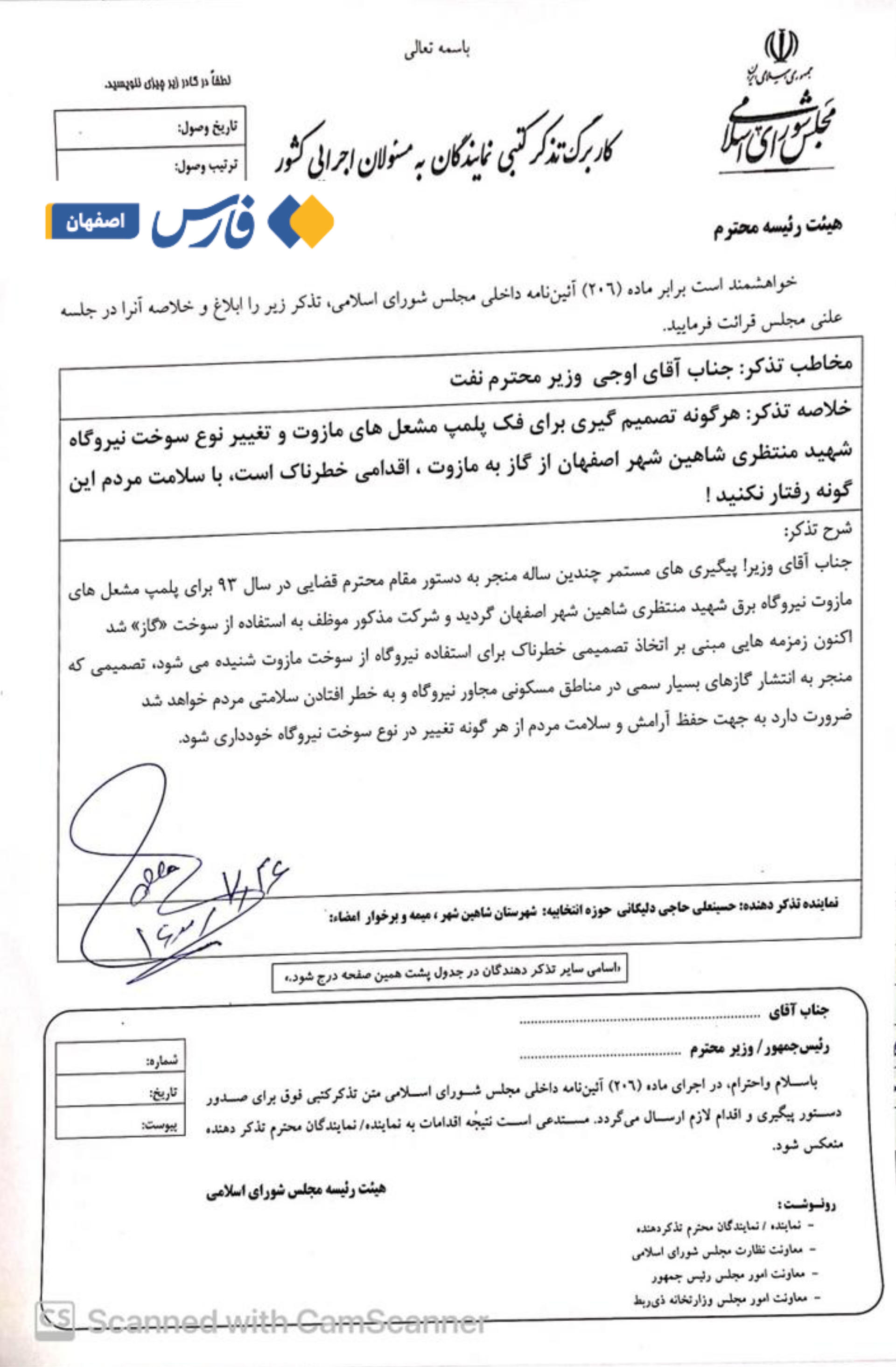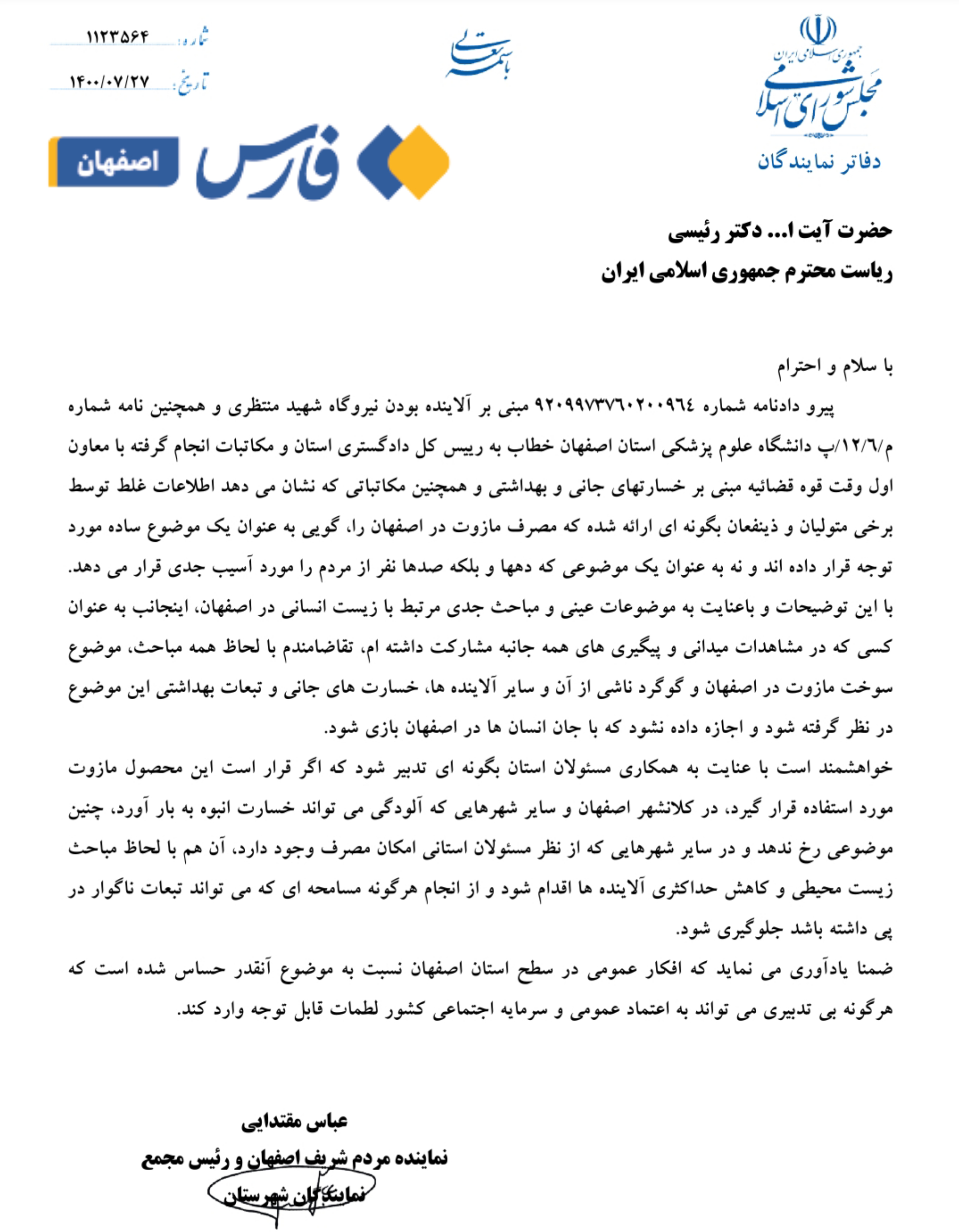 به گزارش خبرگزاری فارس از اصفهان، عباس مقتدایی نماینده مردم اصفهان در مجلس شورای اسلامی خطاب به رئیس جمهور، معاون اول رئیس جمهور، وزیر نفت، دادستان کل کشور و استاندار اصفهان نامهای ارسال کرد.