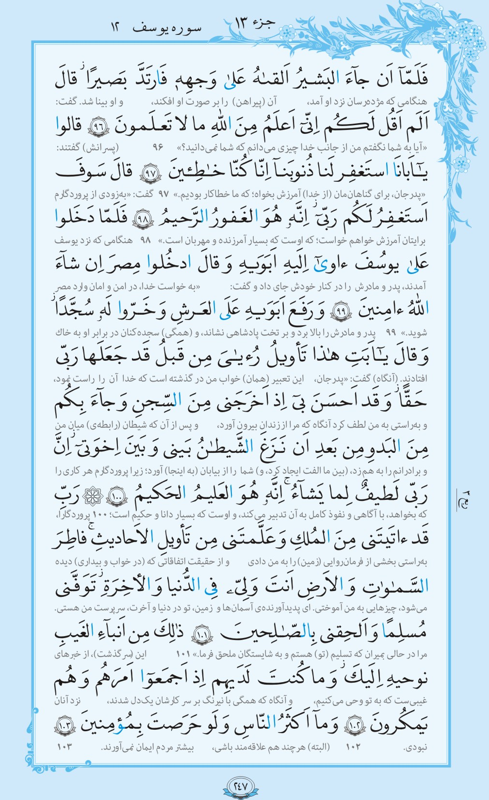 در ادامه تلاوت ترتیل صفحه ۲۴۷ قرآن کریم شامل آیات ۹۶ تا ۱۰۳ سوره مبارکه یوسف با صدای شهریار پرهیزکار تقدیم میشود.
