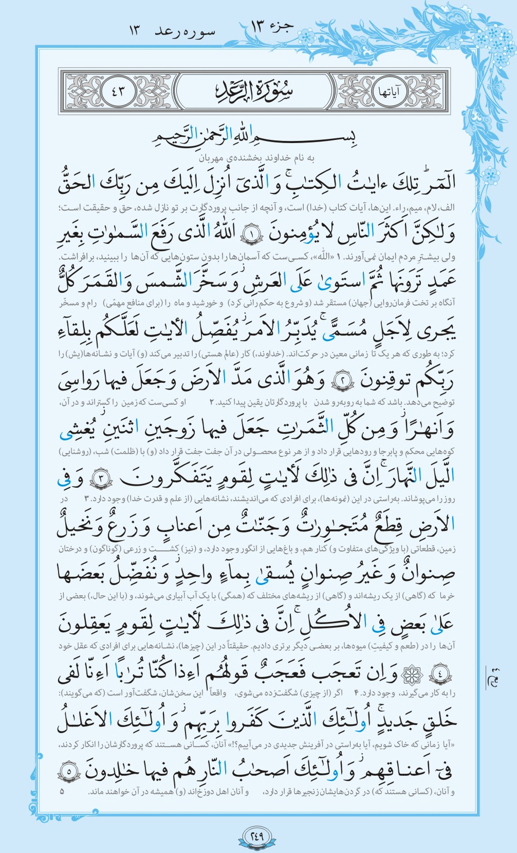 در ادامه تلاوت ترتیل صفحه ۲۴۹ قرآن کریم شامل آیات ۱ تا ۵ سوره مبارکه رعد با صدای شهریار پرهیزکار تقدیم میشود.