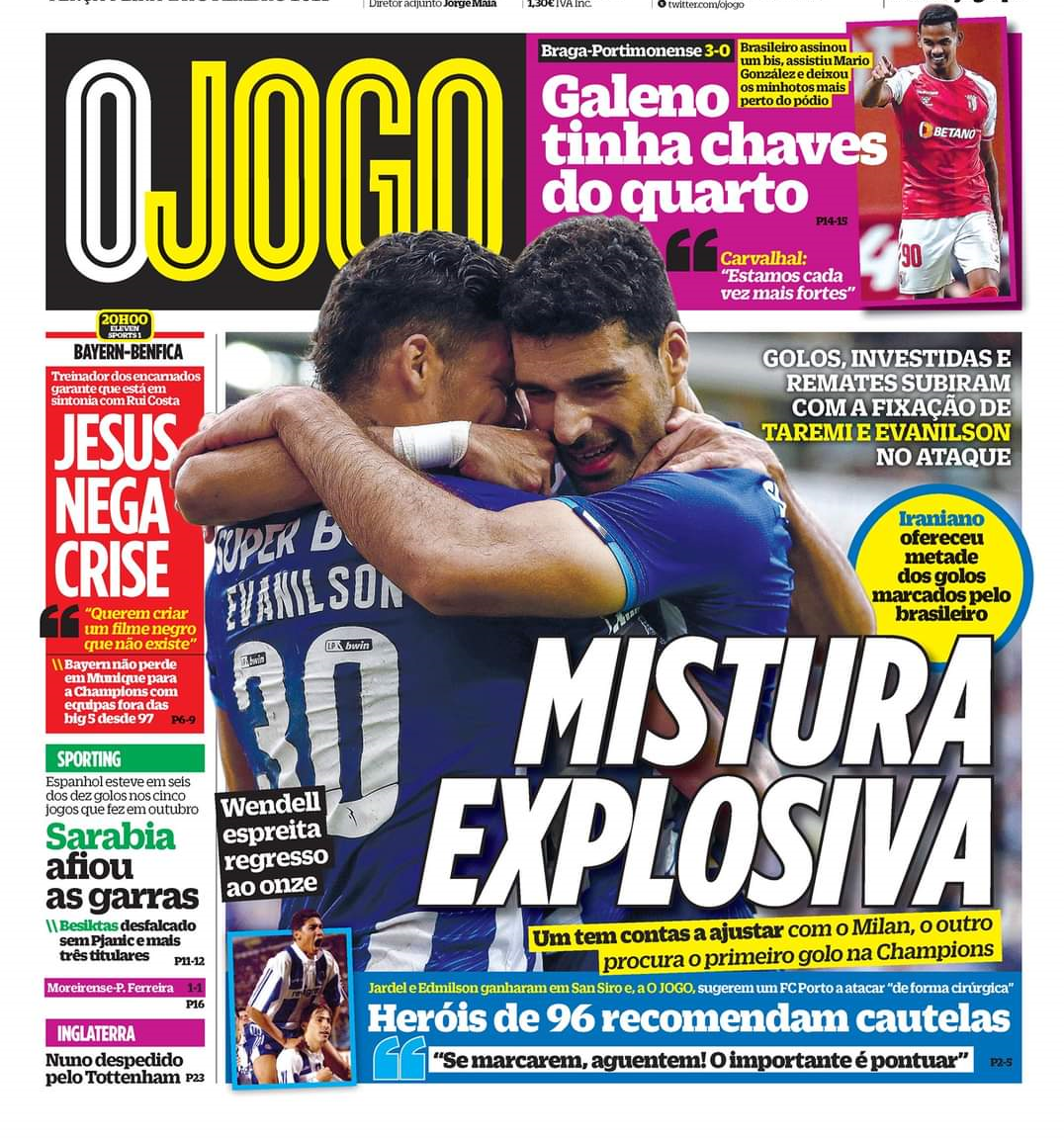 امروز روزنامه اوجوگو زوج طارمی و اوانیلسون را ترکیبی انفجاری نامید و مدعی شد که این خط حمله پورتو میتواند موفقتر از قبل عمل کند. این روزنامه نوشت که تعداد گلها، ضربات و موقعیتهای پورتو با زوج طارمی و اوانیلسون افزایش یافته است.