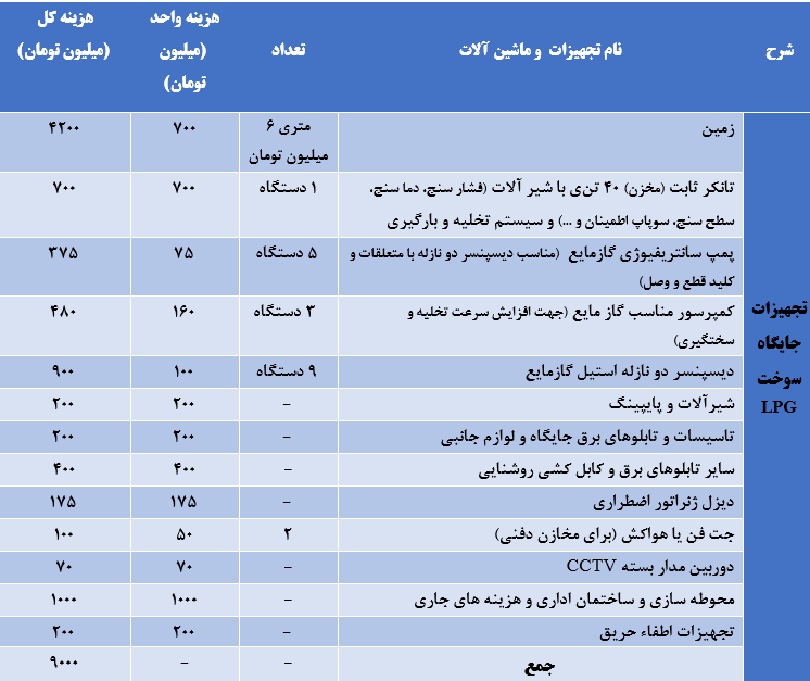 با در نظر گرفتن نیاز به تحویل روزانه 40 تن از هر جایگاه، برای افزودن سالانه 2 میلیون تن LPG به سبد سوخت خودروها، نیاز به احداث تعداد 135 جایگاه اتوگاز در کشور است. در جدول 2 هزینه احداث هر جایگاه سوختگیری LPG بر اساس تجهیزات موردنیاز 9 میلیارد تومان محاسبه شده است. بدین صورت هزینه احداث جایگاههای LPG حدود 1.2 هزار میلیارد تومان میباشد (البته تعداد جایگاههای LPG موردنیاز بسته به مدل توسعه صنعت اتوگاز میتواند کمتر هم بشود).
