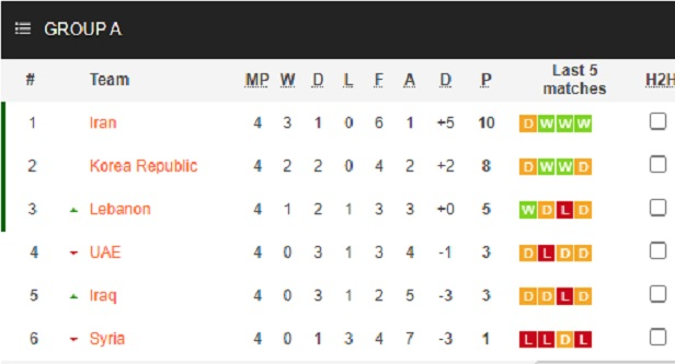 لبنان با این برد 5 امتیازی شد و به کره جنوبی نزدیک شد. سوریه هم با یک امتیاز قعرنشین است.