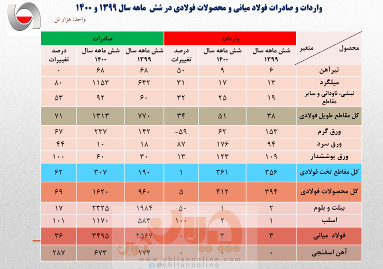 در دوره ۶ ماهه نخست سال جاری، صادرات فولاد میانی کشور، ۳ میلیون و ۴۹۵ هزار تن بوده که رشد ۳۶ درصدی را نسبت به دوره مشابه سال قبل نشان میدهد؛ از صادرات فولاد میانی، سهم صادرات بیلت و بلوم در دوره ۶ ماهه نخست سال ۱۴۰۰، ۲ میلیون و ۳۲۵ هزار تن، و سهم صادرات اسلب، یک میلیون و ۱۷۰ هزار تن بوده است؛ بیشترین درصد رشد صادراتی در این دوره به اسلب با ۱۰۱ درصد رشد اختصاص داشته است.