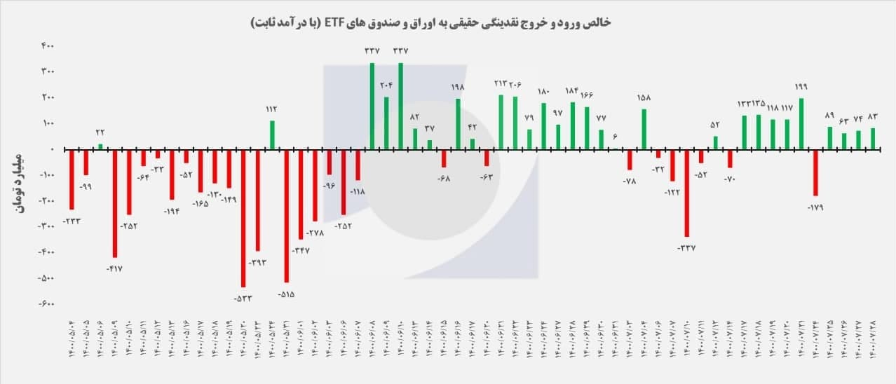 البته پول سرمایهگذاران تا هفته ابتدایی شهریورماه در صندوقهای سهامی و بازار سرمایه جریان داشت و نمودار ورود و خروج پول از صندوهای ETF گواه بر این موضوع است.