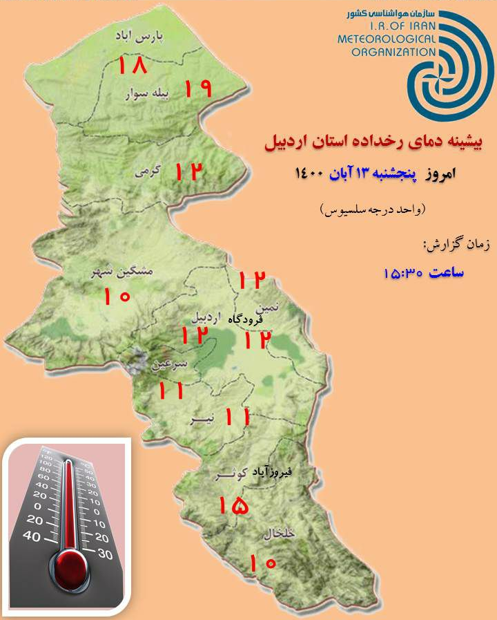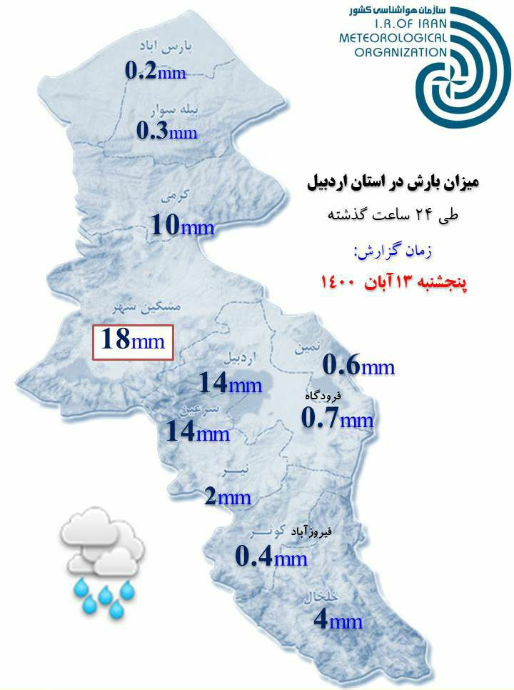 به گزارش خبرگزاری فارس از اردبیل، بر اساس نقشههای سینوپتیکی و آخرین تصاویر ماهواره هواشناسی تا قبل از ظهر امروز (جمعه ۱۴ آبان) بارش خفیف باران در برخی مناطق بهویژه در نواحی منتهی به استان گیلان پیشبینی میشود.