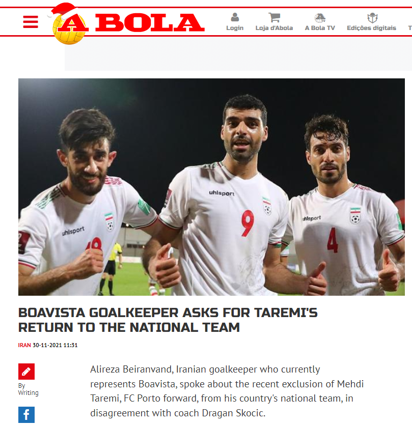 به گزارش خبرگزاری فارس، دوشنبه شب علیرضا بیرانوند در مصاحبه با برنامه فوتبال برتر درخواست کرد که مهدی طارمی به تیم ملی بازگردد که این موضوع سوژه رسانه پرتغالی شد.