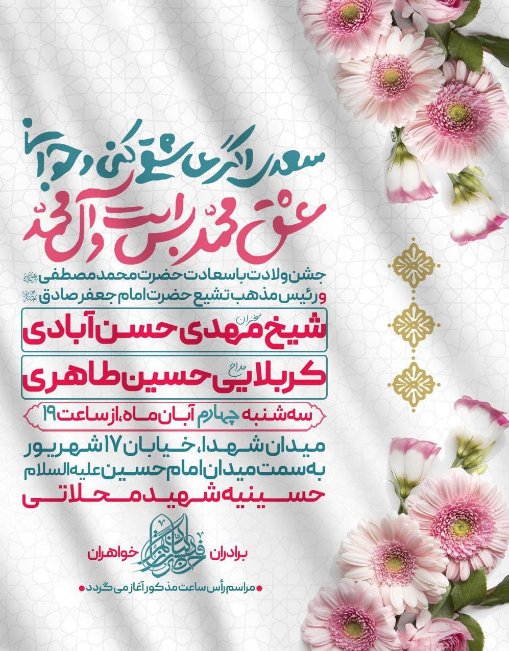 به گزارش خبرنگار حوزه مسجد و هیأت خبرگزاری فارس، مراسم جشن میلاد پیامبر(ص) و امام صادق(ع) در هیأتهای میثاق با شهدا و فدائیان حضرت زهرا(س) فردا سهشنبه ۴ آبانماه برگزار میشود.