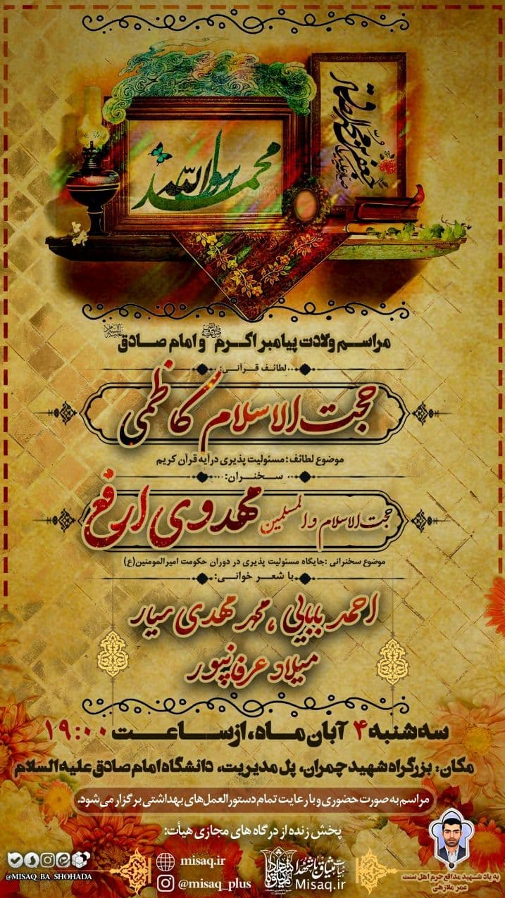 مراسم جشن هیأت میثاق با شهدا نیز با بیان لطائف قرآنی حجتالاسلام کاظمی، سخنرانی حجتالاسلام مهدوی ارفع و شعرخوانی احمد بابایی، مهدی سیار و میلاد عرفانپور از ساعت ۱۹ در مسجد دانشگاه امام صادق(ع) برگزار میشود.