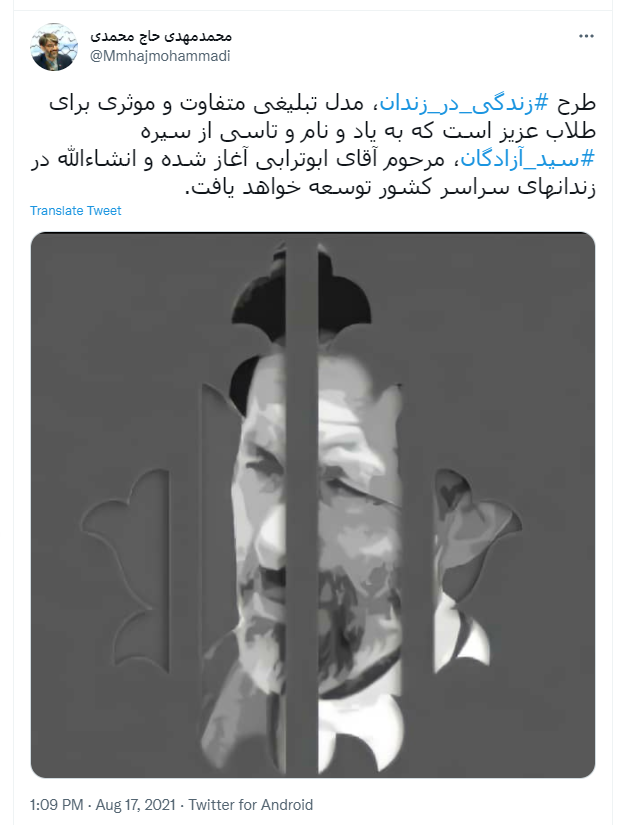 به گزارش خبرگزاری فارس، محمدمهدی حاج محمدی رئیس سازمان زندانها در صفحه شخصی خود در توئیتر نوشت: «طرح زندگی در زندان، مدل تبلیغی متفاوت و موثری برای طلاب عزیز است که به یاد و نام و تاسی از سیره سید آزادگان، مرحوم آقای ابوترابی آغاز شده و انشاءالله در زندانهای سراسر کشور توسعه خواهد یافت.»
