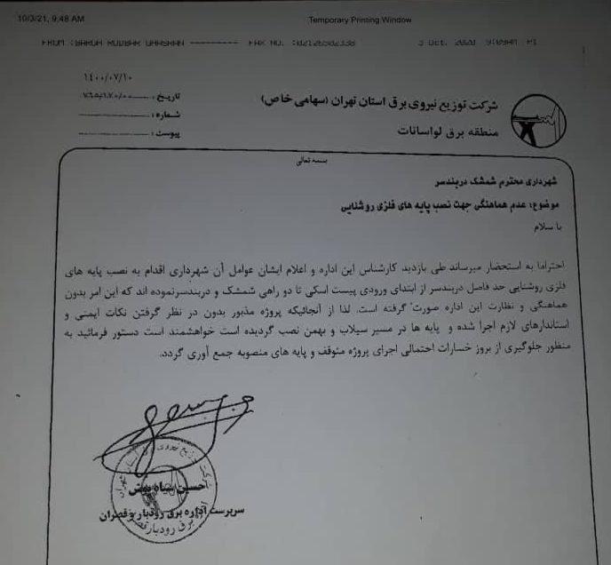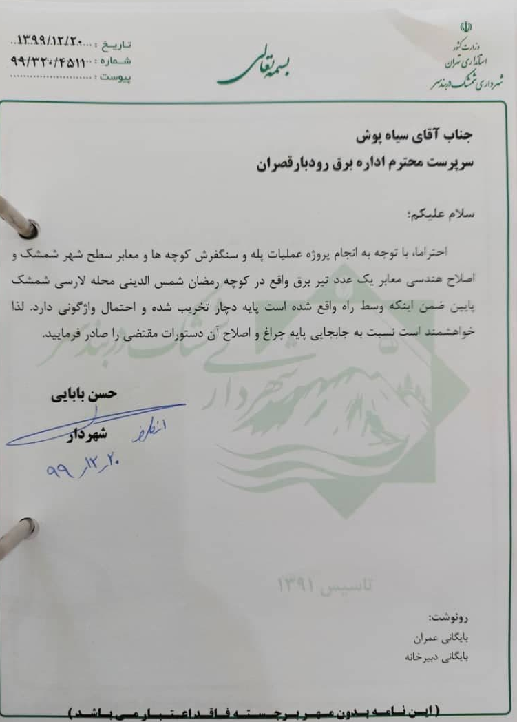 در این باه مهدی ساوهشمشکی، سرپرست شهرداری شمشک دربندسر اظهار کرد: اداره برق رودبار قصران در حالی این نامه را ارسال کرده است که حدو یک ماه از افتتاح آن میگذرد و شهرداری بابت آن ۱ میلیارد و ۷۵۰ میلیون تومان هزینه کرده است.