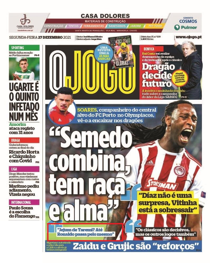 این مطلب در جلد روزنامه اوجوگو قرار گرفت تا موضوع حمایت از طارمی دوباره بر سر زبانها بیفتد. بامداد جمعه در آخرین بازی سال 2021 ، پورتو به مصاف بنفیکا در رقابتهای لیگ خواهد رفت. پیروزی در این مسابقه بسیار اهمیت خواهد داشت و باید دید آیا طارمی میتواند با گلزنی مقابل بنفیکا هم سال را با گل به پایان برساند و هم به انتقادها و حمایتها پاسخ دهد؟