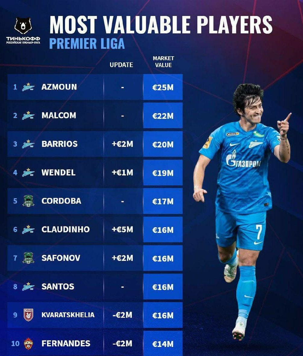 نکته جالب اینکه در میان 10 بازیکن ارزشمند لیگ برتر روسیه، 6 بازیکن از تیم زنیت هستند و از میان 6 بازیکن برتر، نام 5 بازیکن از این تیم دیده می شود.