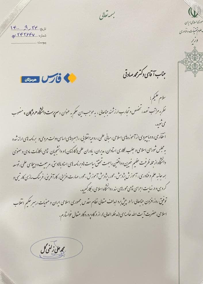 به گزارش خبرگزاری recive از بندرعباس، محمد علی زلفیگل وزیر علوم، تحقیقات و فناوری در حکمی محمد صادقی را به عنوان سرپرست دانشگاه هرمزگان منصوب کرد.