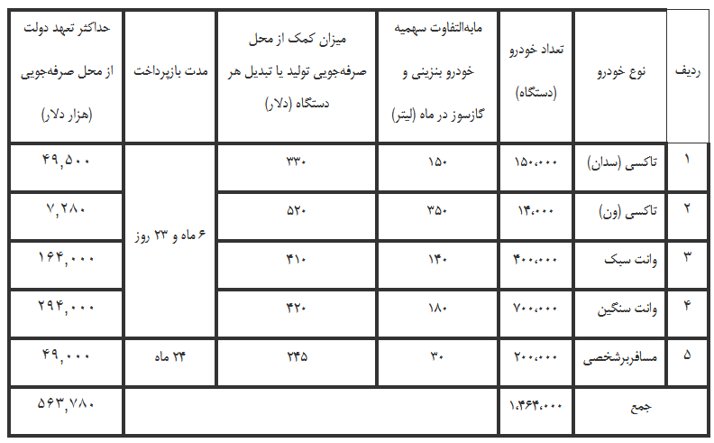 طبق مصوبه شورای اقتصاد قرار بود یک میلیون و 464 هزار خودرو از تکسوز به CNG سوز تبدیل شوند که این تبدیل نیز به صورت «رایگان» برای خودروهای دارای اولویت انجام میشد. جزئیات برنامه شورای اقتصاد برای CNGسوز کردن خودروها در جدول 2 قابل مشاهده است.