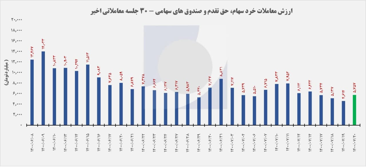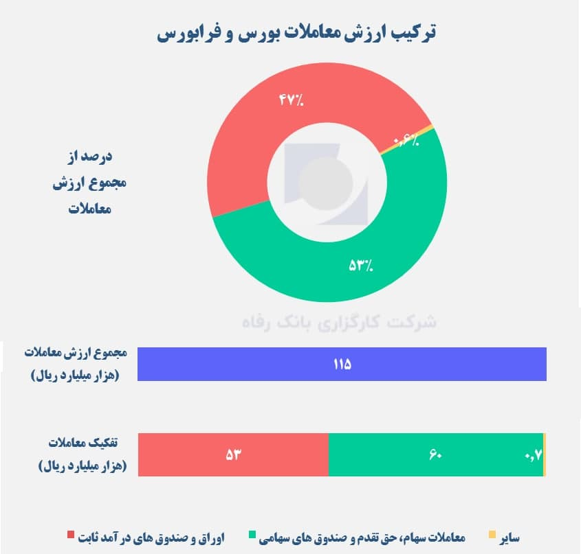 همچنین طبق نمودار تفکیک ارزش معاملات، ۵۳ درصد معاملات مربوط به معاملات سهام و صندوقهای سهامی و ۴۷ درصد آن مربوط به صندوقهای درآمد ثابت و اوراقها میباشد که اگرچه هنوز هم سهم معاملات سهام بیشتر است، اما کاهش چشمگیر درصد سهم ارزش معاملات سهام از کل ارزش بازار، نشاندهنده خروج پول از بازار سهام میباشد.
