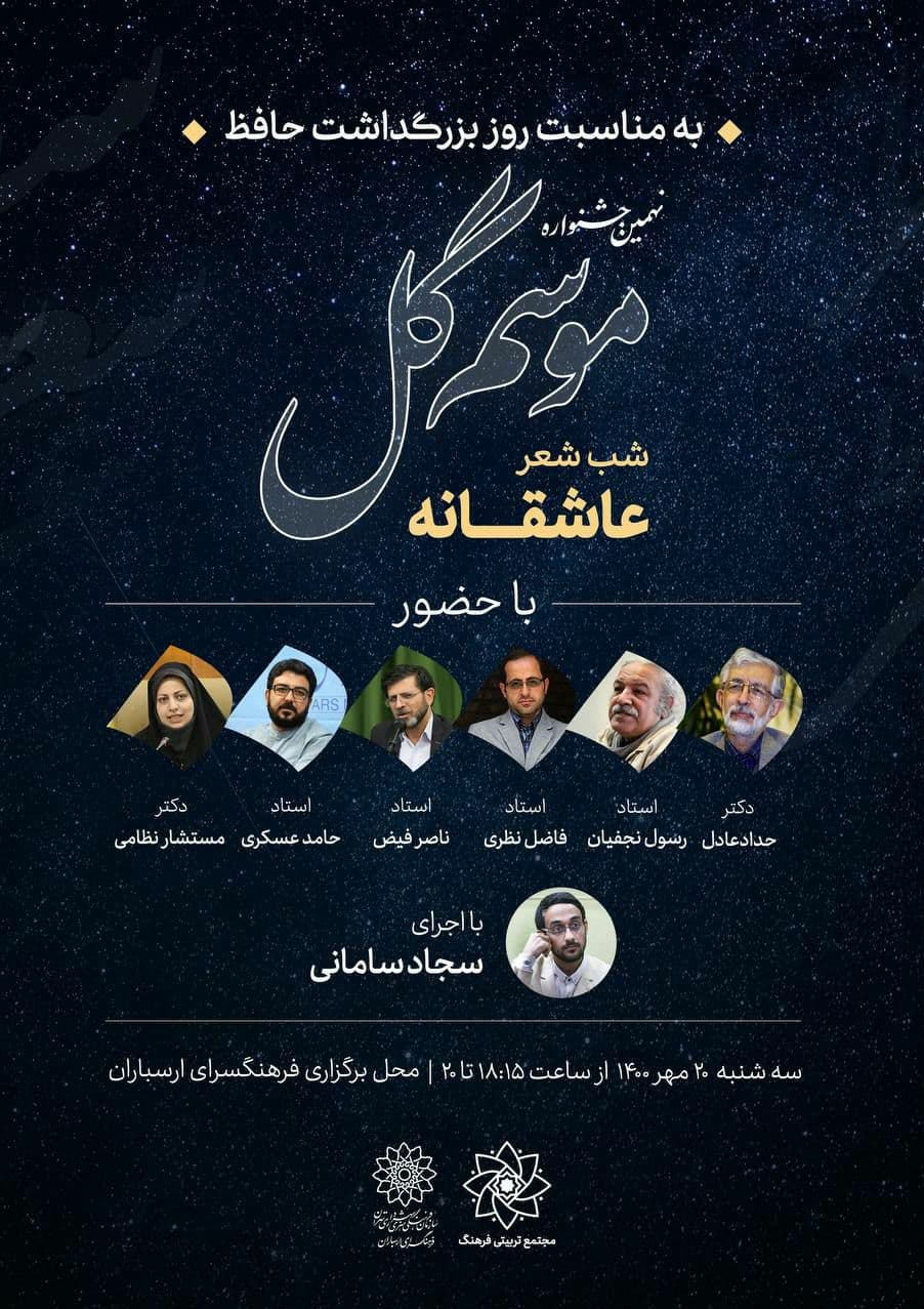 به گزارش خبرنگار قرآن و فعالیتهای دینی خبرگزاری فارس شب شعر موسم گل، به مناسبت ۲۰ مهر روز بزرگداشت حافظ، باحضور اساتید برجسته، در فرهنگسرای ارسباران برگزار میشود.