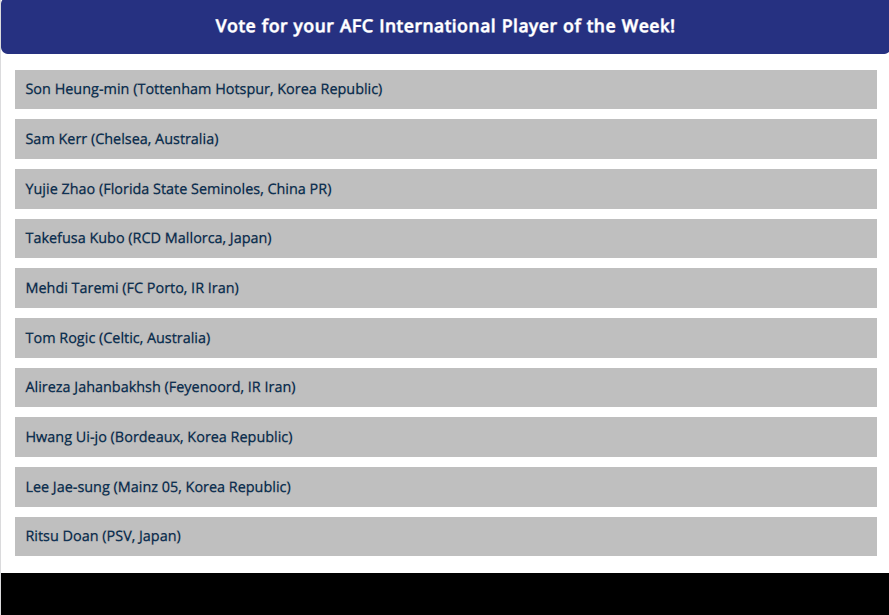 اسامی نامزدهای بهترین لژیونر هفته آسیا به شرح زیر است. برای رای دادن به اینجا بروید: